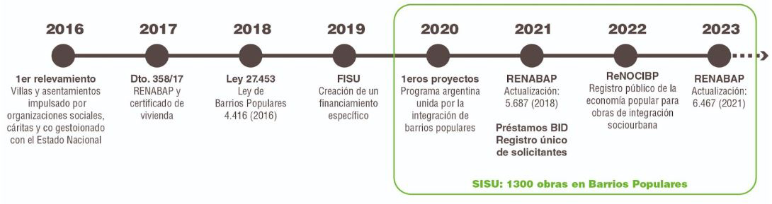 A lo largo de este periodo, se consolidó un marco legal respaldado por consensos políticos en torno a los déficits estructurales del hábitat y a la necesidad de contar con presupuestos adecuados para diseñar e implementar soluciones a mediano y largo plazo para millones de personas en Argentina. En ese marco, se promovió una articulación activa entre asociaciones civiles, entidades de la economía popular, gobiernos provinciales y municipales, así como con vecinos y vecinas de los barrios populares y otras formas de organización comunitaria.