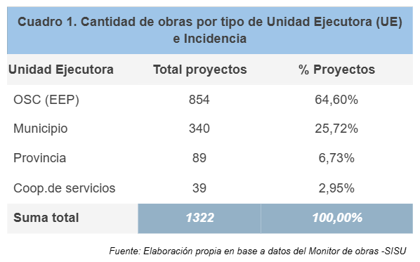 Según datos recolectados en el Monitor de obras de la SISU, las Entidades de la Economía Popular fueron las principales Unidades Ejecutoras, realizando 854 proyectos de obra, lo que representa un 64,6% respecto del total. Cabe destacar que es un porcentaje ampliamente superior al 25% establecido por la Ley 27.453. Luego, le siguen los gobiernos municipales y provinciales con proyectos que representan un 25,7% y un 6,7% respectivamente. La evidencia cuantitativa disponible permite dimensionar el alcance de este modelo de ejecución.