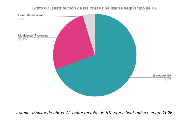 Otro dato relevante refiere al desempeño en la finalización de los proyectos. Sobre un total de 513 obras que alcanzaron un 100% de avance físico, el 69,4% corresponden a las EEP. Este dato muestra la capacidad de este tipo de Unidades Ejecutoras en la concreción de los proyectos y contrasta fuertemente con uno de los principales mitos sobre las cooperativas de trabajo, demostrando objetivamente su eficacia en el cumplimiento de las obras.